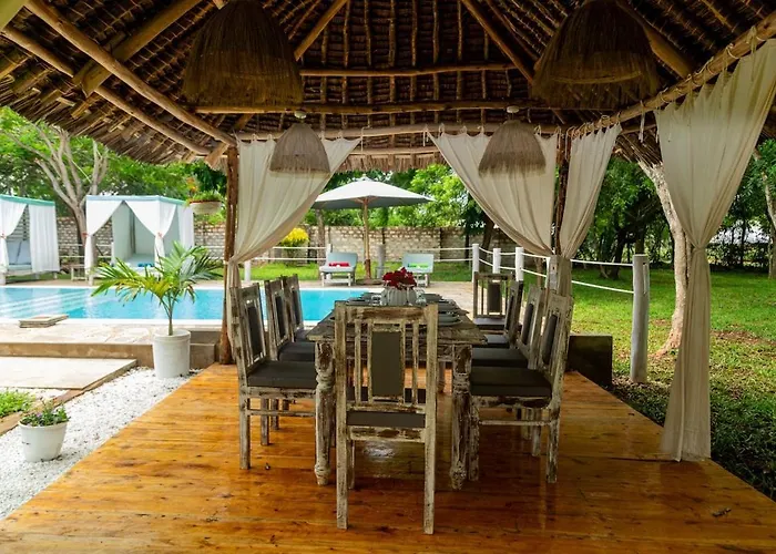 The beachfront Kikambala Eco Villas Mombasa is located 20 minutes' walk from Kipepeo Aquarium and provides an outdoor swimming pool, ensuring a relaxing stay. Guests of this 8-room villa, situated in the Bamburi Beach district can also enjoy complimentary private parking on site.
